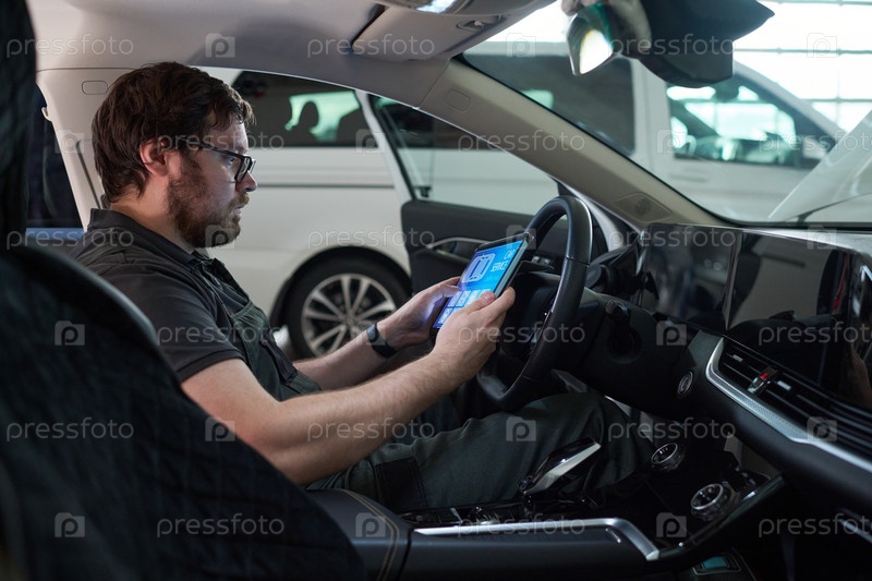 Молодой взрослый белый мужчина использует цифровой планшет, сидя внутри машины