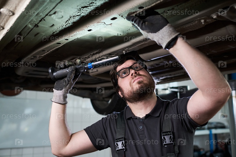 Кавказский молодой взрослый мужчина ремонтирует автомобильное подземное колесо в автомастерской
