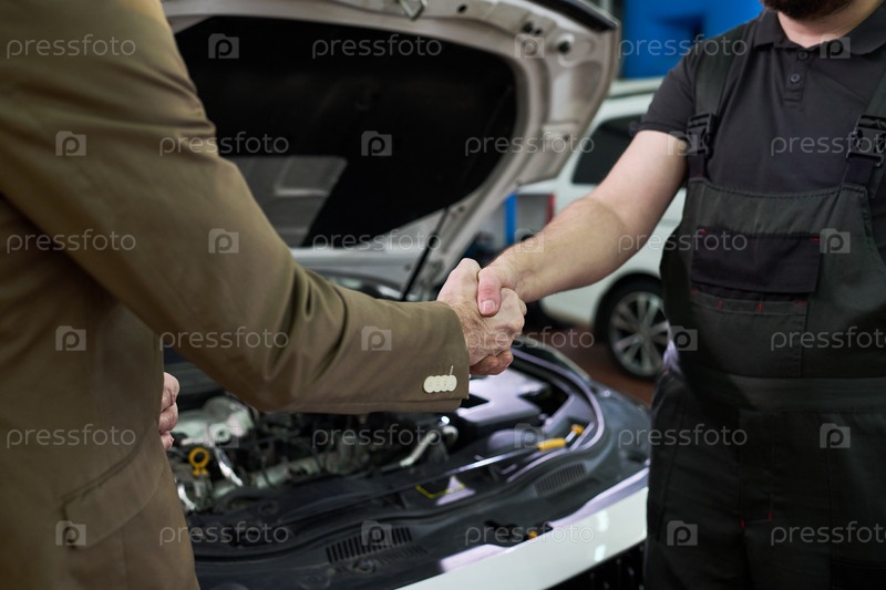 Кавказский мужчина среднего возраста, пожавший руку механику в автосервисе