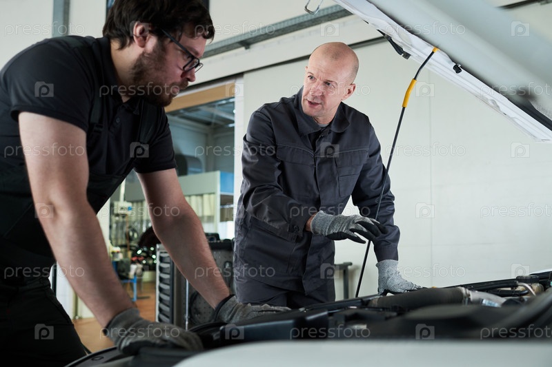 Кавказский мужчина средних лет обучает молодого взрослого человека ремонту автомобильного двигателя