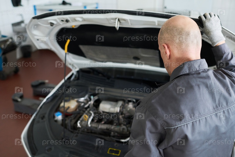Кавказский мужчина средних лет осматривает открытый капот автомобиля во время технического обслуживания