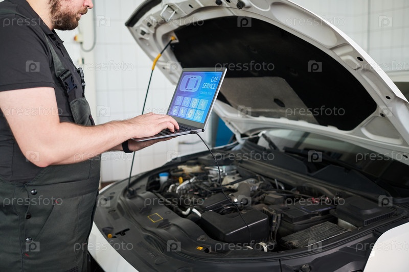 Молодой взрослый кавказский мужчина выполняет цифровую диагностику на автомобильном двигателе