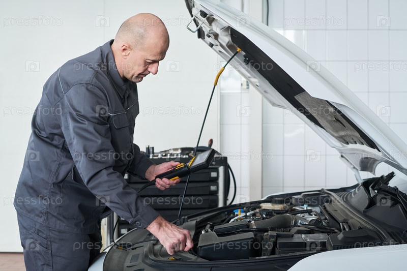 Кавказский мужчина средних лет проверяет двигатель автомобиля с помощью диагностического инструмента