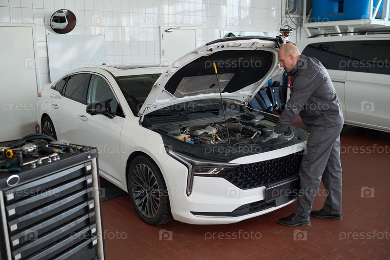 Кавказский мужчина средних лет осматривает моторное отделение современного автомобиля в помещении