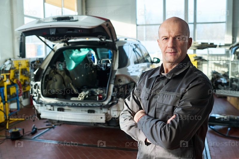 Портрет белого мужчины средних лет, уверенно стоящего в автосервисе