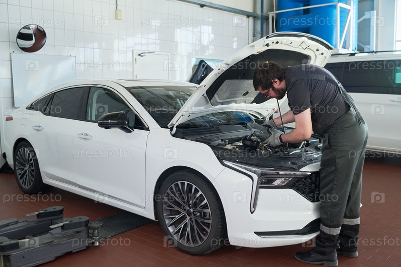 Молодой взрослый кавказский мужчина ремонтирует автомобильный двигатель в современной автомастерской