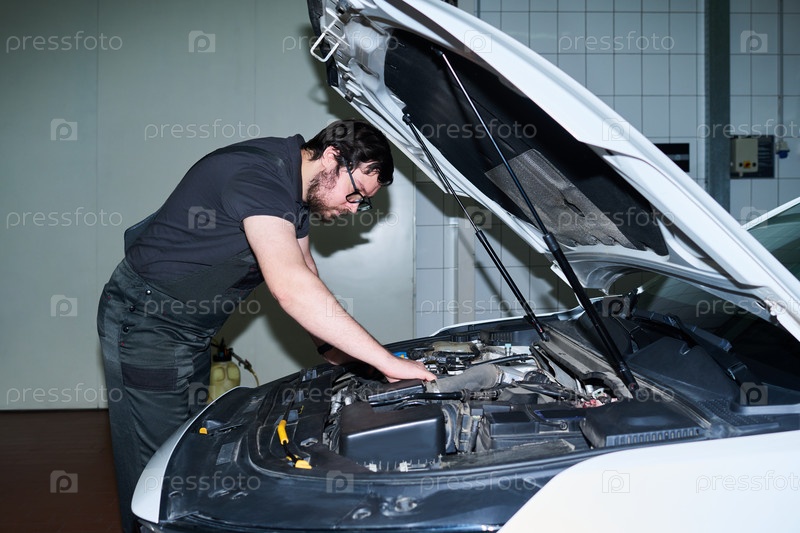 Молодой взрослый кавказский мужчина ремонтирует двигатель в автомобильной мастерской
