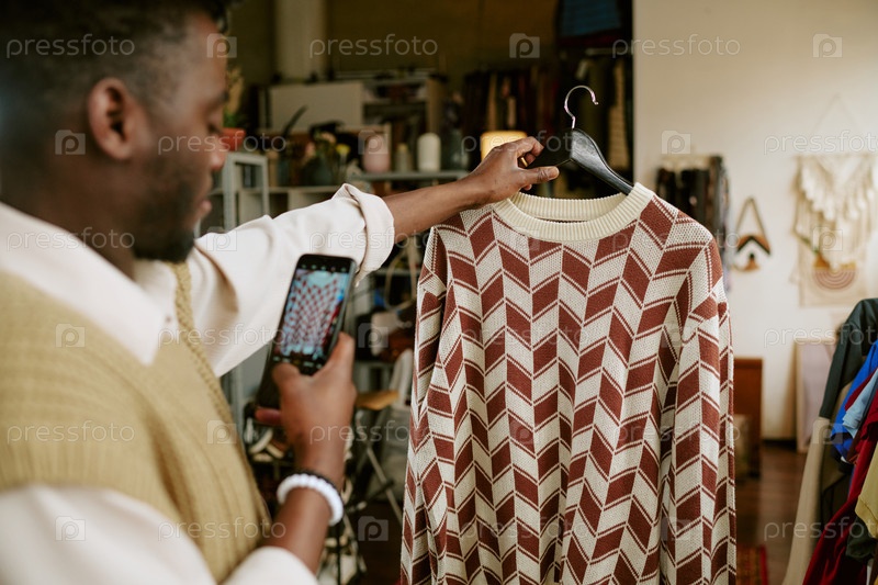 Молодой взрослый чернокожий мужчина фотографирует секонд-хенд свитер в магазине