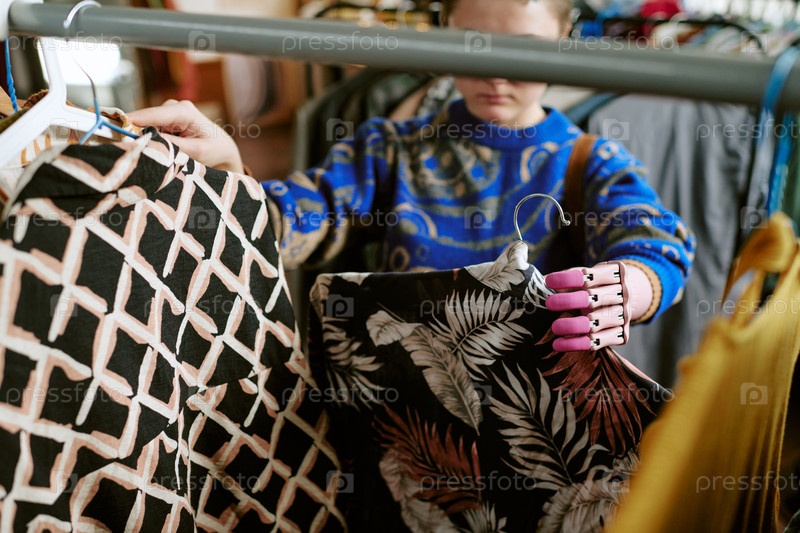 Молодая кавказская женщина с протезированной рукой просматривает раковину для одежды второй руки