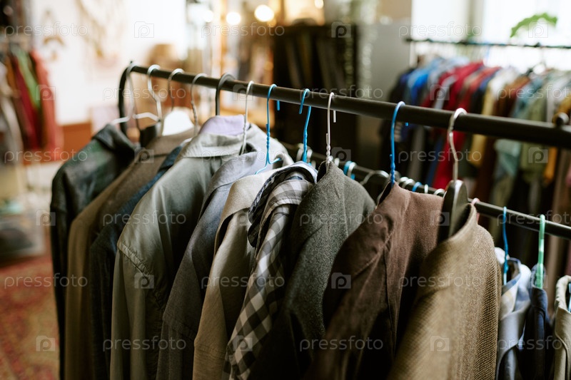 Ассортимент одежды подержанной руки, висящей на стеллаже в среде магазинов вторичной торговли