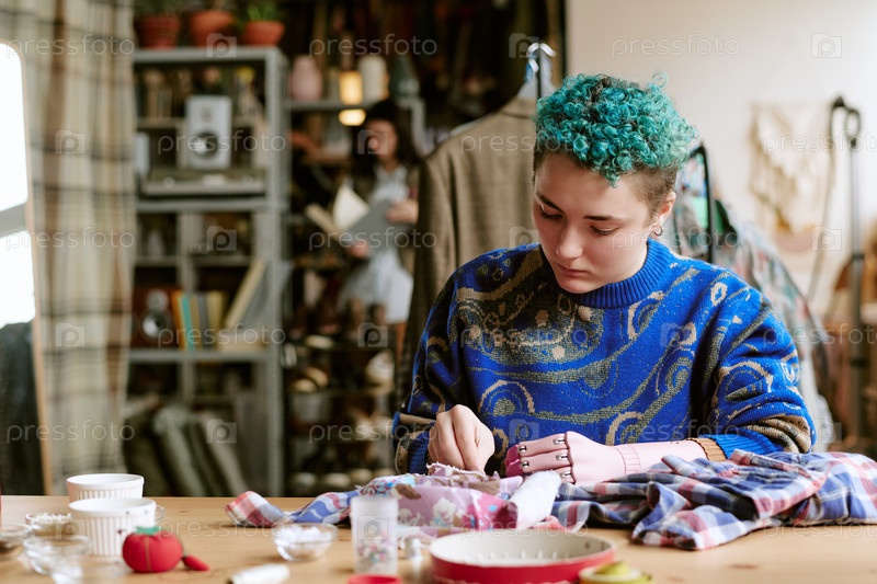 Молодая взрослая кавказская женщина ремонтирует одежду подержанную в условиях мастерской