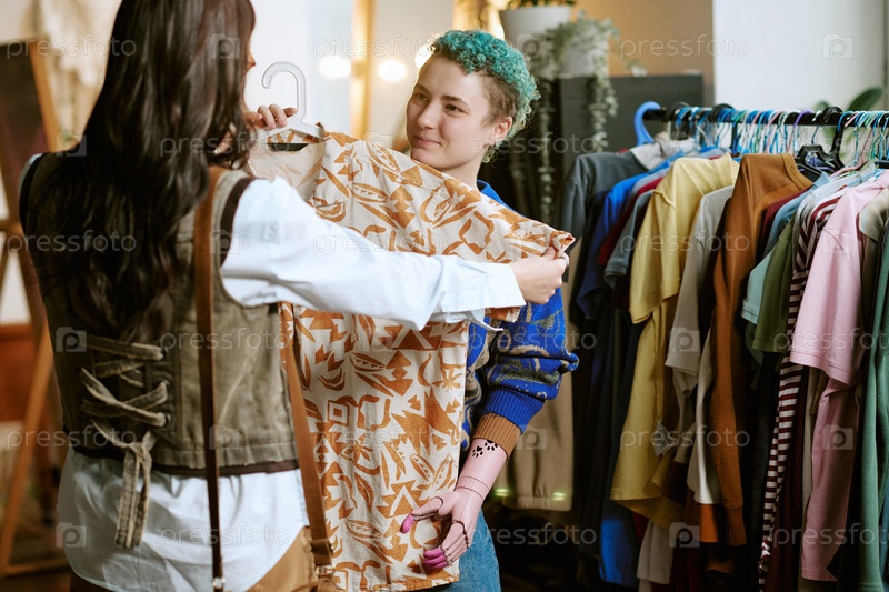 Молодая белая женщина показывает одежду подержанную улыбающейся молодой женщине