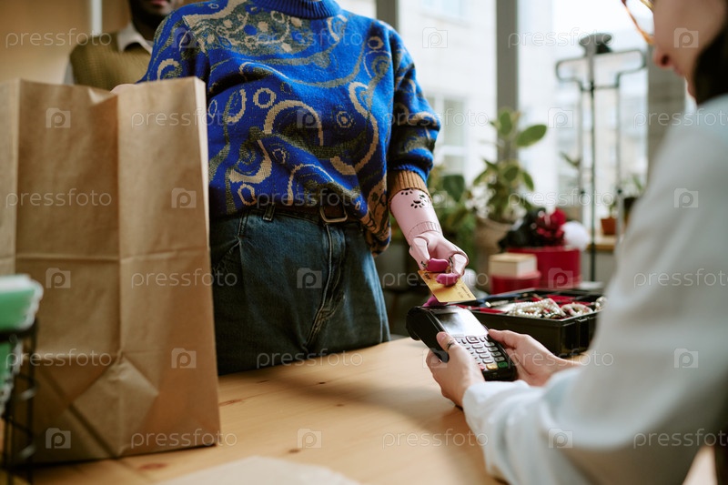 Непризнанная женщина с протезированной рукой платит в магазине подержанных товаров