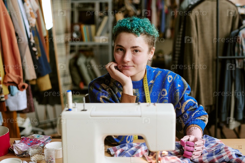Портрет женщины с протезированной рукой, работающей со старым одеждой