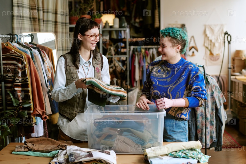 Две молодые взрослые белокожие женщины сортируют одежду подержанной в магазине