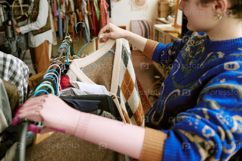 Молодая белая женщина просматривает одежду подержанной в магазине