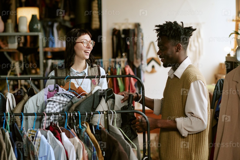 Молодая бирациальная женщина и молодой чернокожий мужчина покупают одежду подержанной продукции