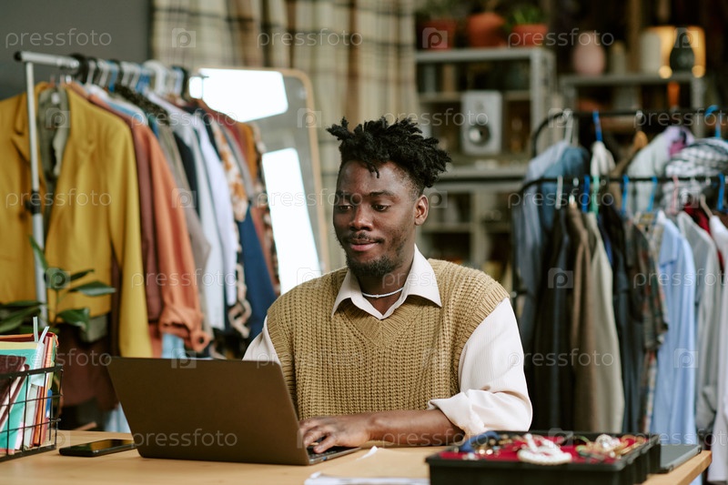 Молодой взрослый чернокожий мужчина продает одежду подержанную онлайн в магазине Young Adult Black Man Selling Second Hand Clothing Online in Store Setting