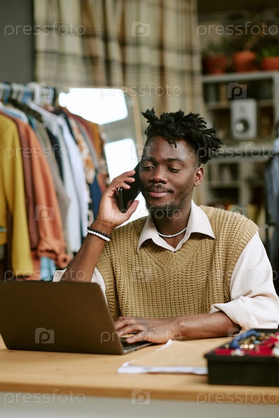 Молодой взрослый чернокожий мужчина, управляющий бизнесом по продаже одежды второй руки, улыбаясь