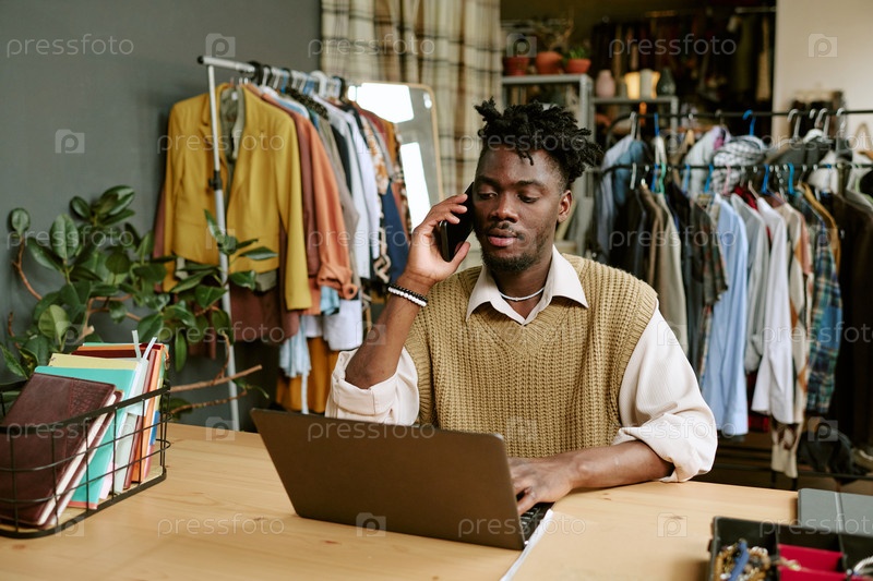 Молодой взрослый чернокожий мужчина управляет магазином одежды подержанной продукции Инвентаризация удаленно