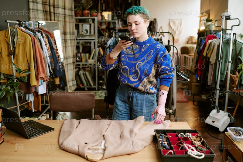 Молодая взрослая белая женщина с протезированной рукой фотографирует одежду подержанную