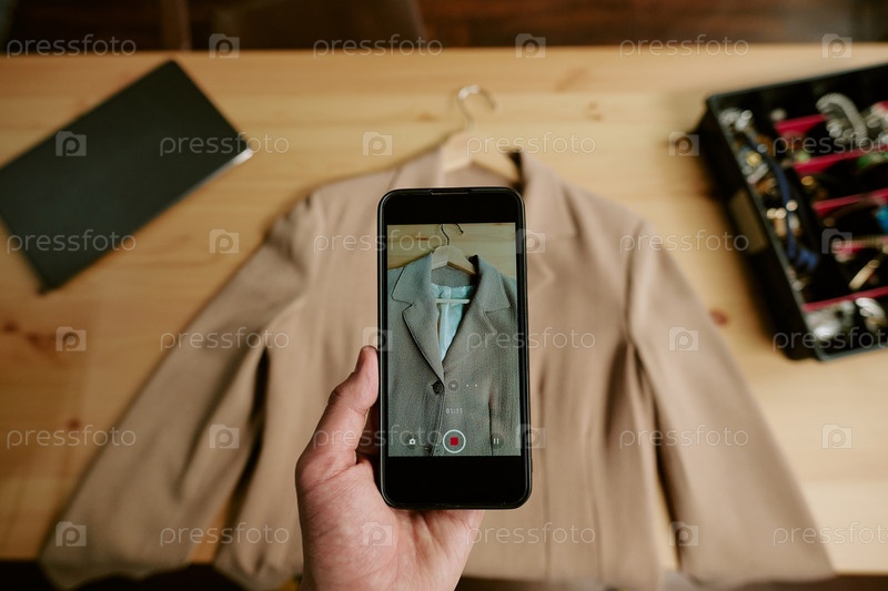 Кавказский молодой взрослый мужчина фотографирует блейзер второй руки для онлайн-продажи