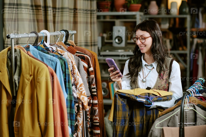 Молодая бирациальная женщина просматривает одежду подержанную при использовании смартфона