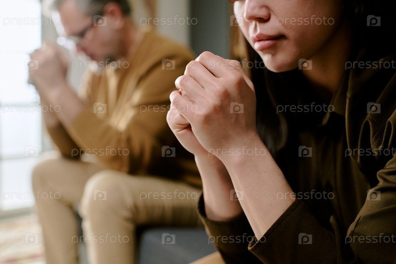 Молодая женщина и мужчина средних лет сидят и молятся в помещении