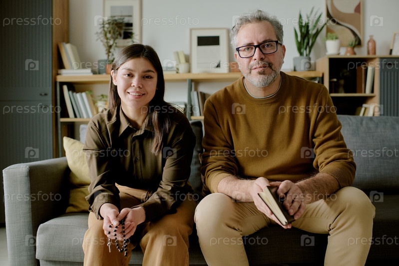 Портрет молодой взрослой женщины и мужчины среднего возраста, сидящих в помещении