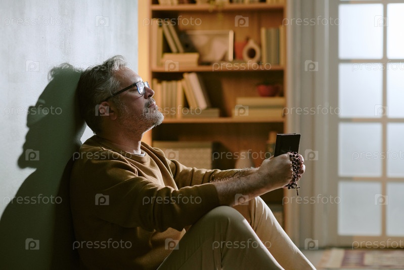 Мужчина средних лет сидит на стене, держит молебен и молится