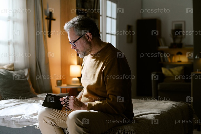 Мужчина средних лет молится с розариями, сидя в помещении