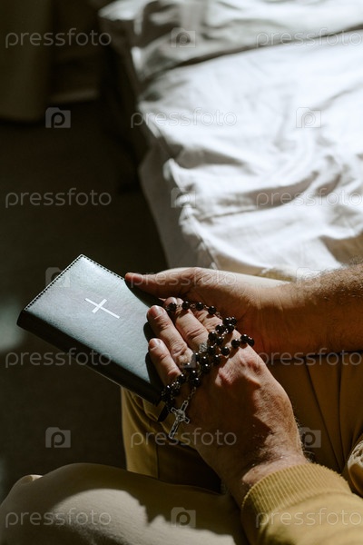 Мужчина средних лет молится с Розарием и Библией, сидя в помещении