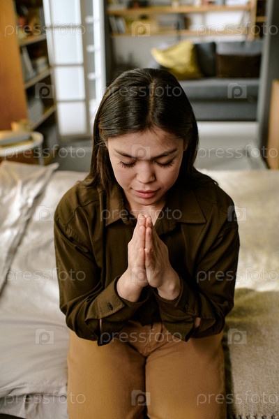 Молодая взрослая азиатская женщина сидит на кровати и молится с закрытыми глазами в помещении