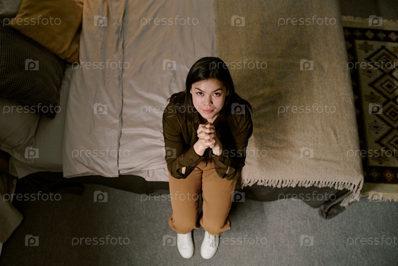 Портрет молодой взрослой азиатской женщины, сидящей на кровати, смотрящей вверх и молящейся
