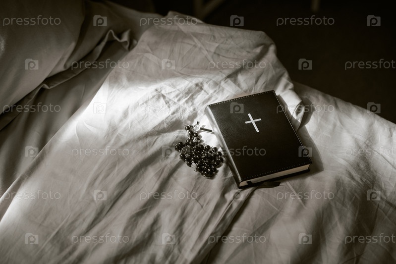 Библия и Розарий, лежащие на кровати, символизирующие веру и духовное размышление