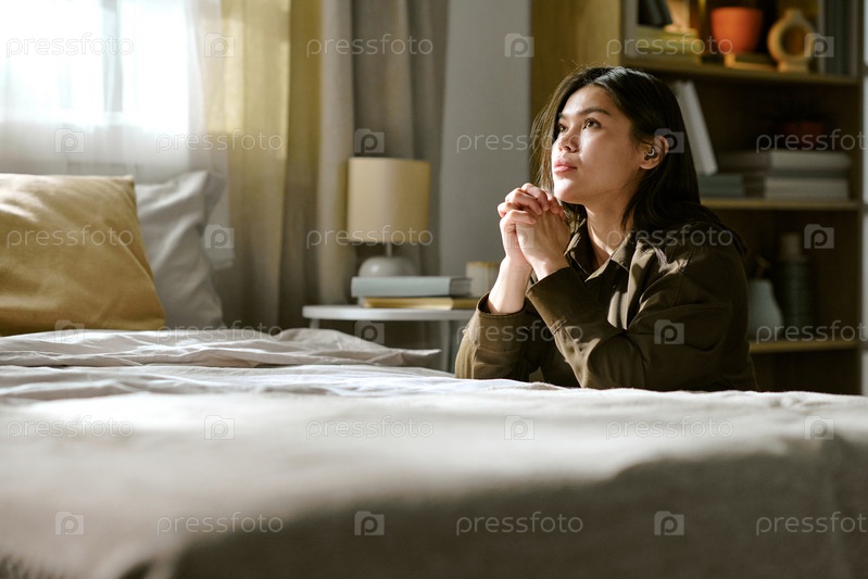 Молодая взрослая азиатская женщина на коленях возле кровати молится с надежным выражением лица