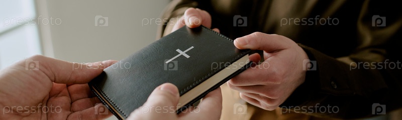 Header of Рука, дающая Библию молодой взрослой женщине в помещении