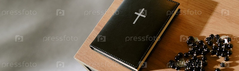 Заголовок Христианской Библии и Розария Бусы, отдыхающие на деревянном столе под солнечным светом