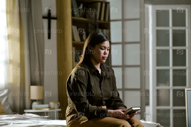 Молодая взрослая азиатская женщина сидит на кровати, держит книгу и задумчиво смотрит вниз