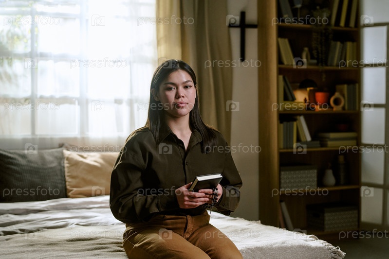 Портрет молодой взрослой азиатской женщины, сидящей в помещении и держащей Библию