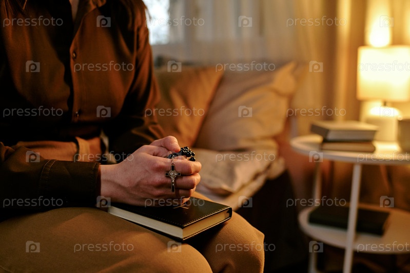 Женщина молится с Розарием, сидя в помещении