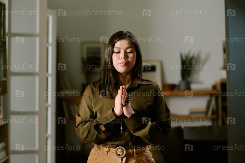 Молодая взрослая коренная женщина медитирует в помещении с закрытыми глазами и молится