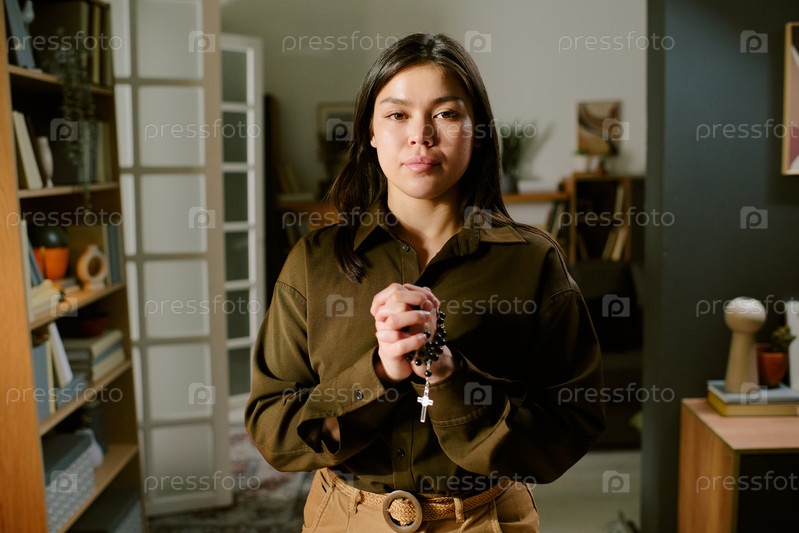 Портрет молодой взрослой женщины, молящейся в помещении с розариями