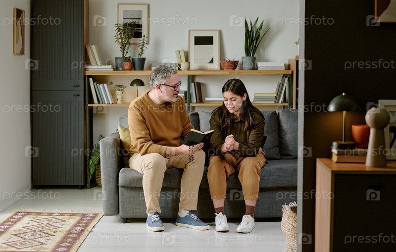 Мужчина средних лет утешает молодую взрослую женщину на диване