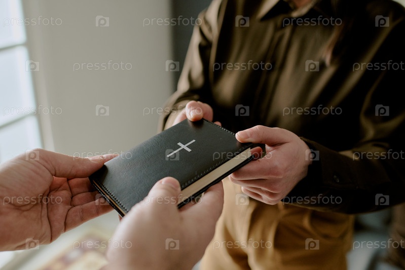 Женщина вручает Библию мужчине в помещении днем