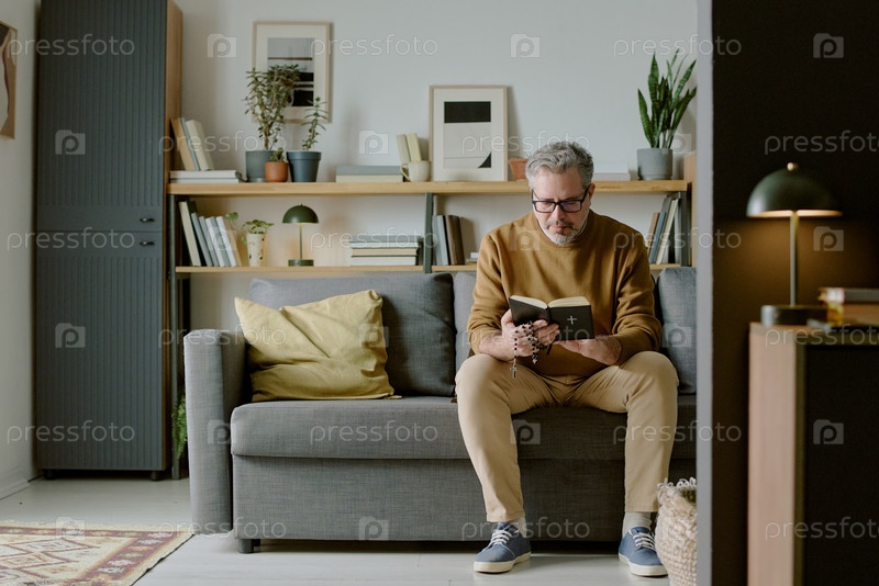 Мужчина средних лет, сидящий на диване и читающий Священную книгу в помещении