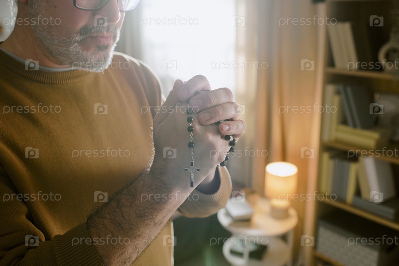 Мужчина среднего возраста молится в помещении, держа розарий в руках