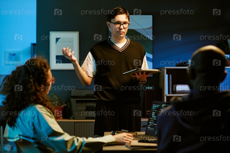Молодой взрослый белый мужчина объясняет детали проекта различным коллегам