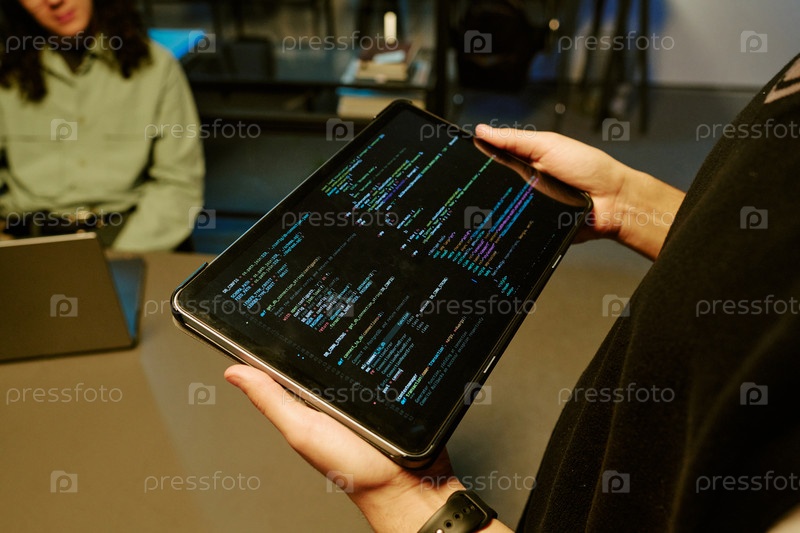Молодой взрослый кавказский мужчина держит планшет, отображающий красочный программный код