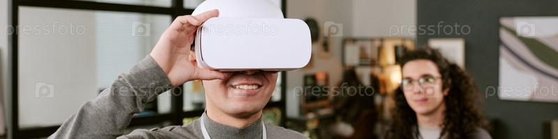 Кавказский мальчик испытывает технологию виртуальной реальности в помещении